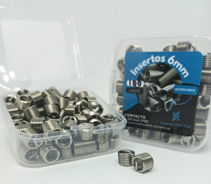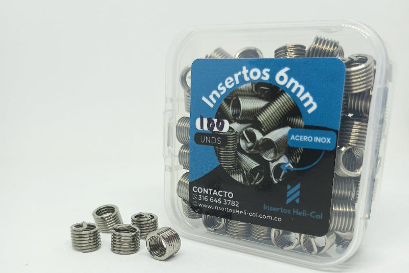 Repara y refuerza roscas dañadas con nuestros insertos roscados de 6mm de insertos Heli-Col, fabricados con acero inoxidable de alta calidad que garantiza resistencia, precisión y una vida útil prolongada en todas tus aplicaciones mecánicas e industriales.